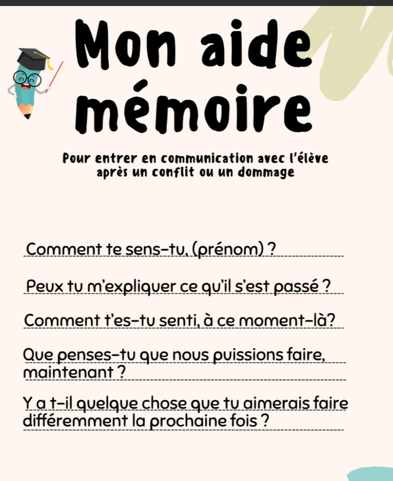 Dans ce fichier, vous trouverez 3 aides mémoire pour vous aider à dialoguer avec les élèves, à trouver des alternatives aux cris ou à la punition et à encourager les comportements positifs en classe.