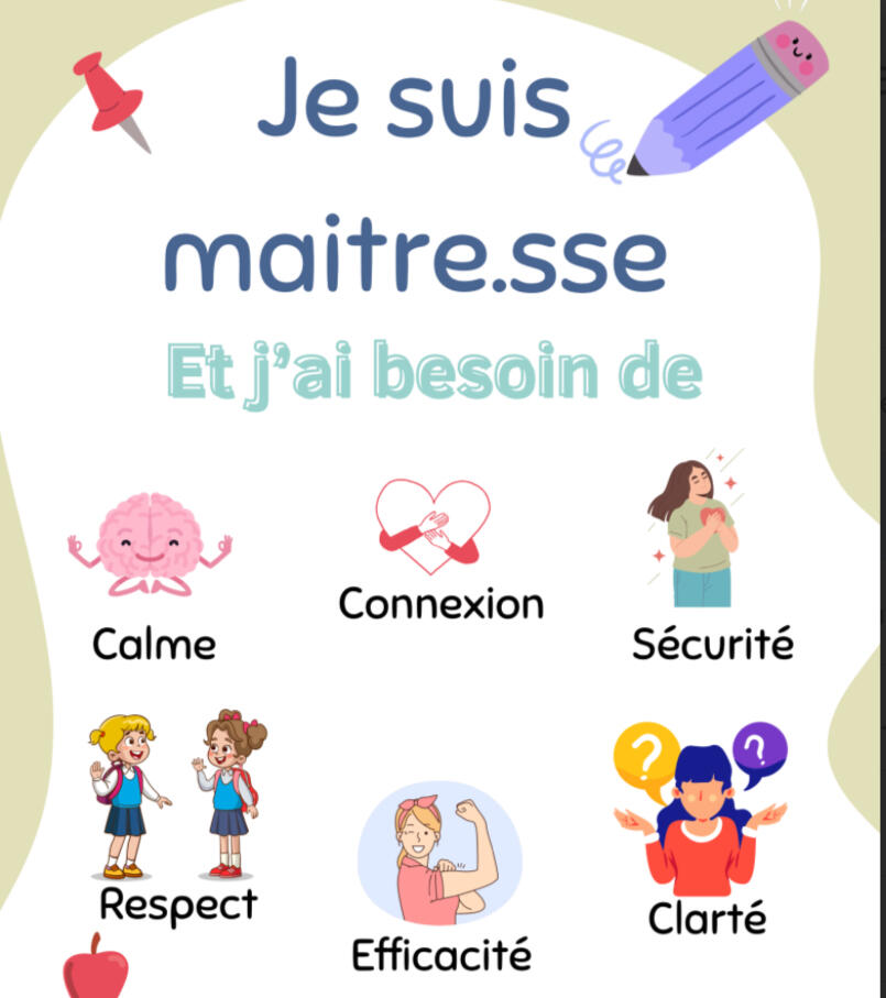 On oublie souvent que les maitre.sses ont eux aussi ont des besoins. Cette affiche rappelle leurs besoins et permet ainsi la formulation de demandes claires en classe.